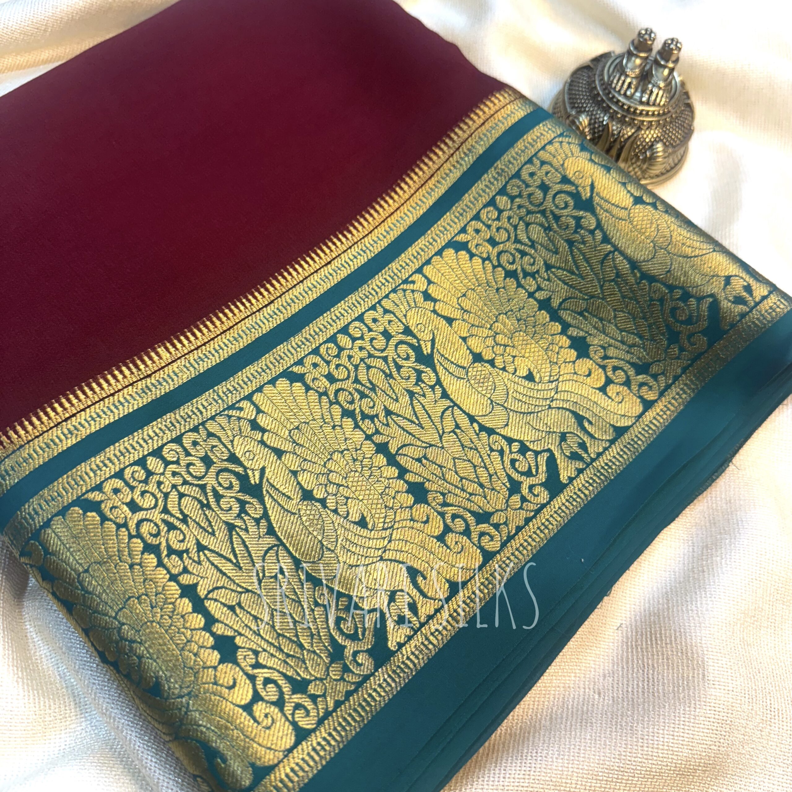 A classic pure crepe Mysore silk saree featuring a maroon toned body paired with a refreshing teal green contrast border woven in luminous zari. Traditional peacock motifs add a touch of heritage elegance.